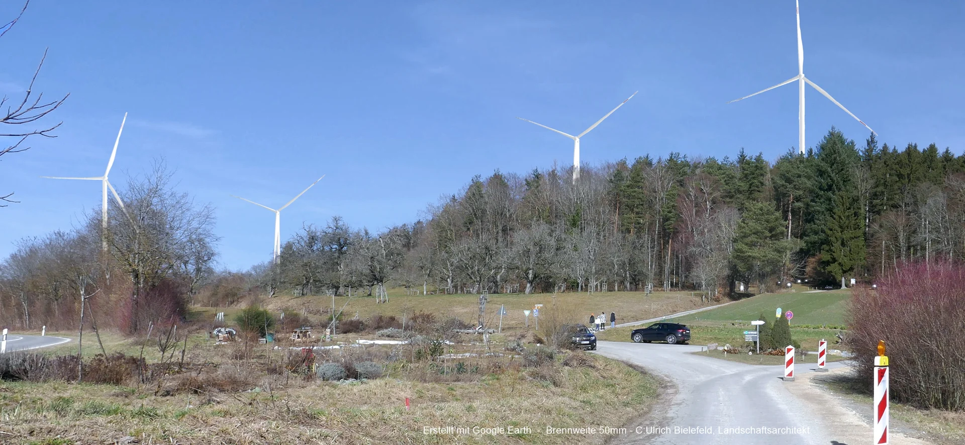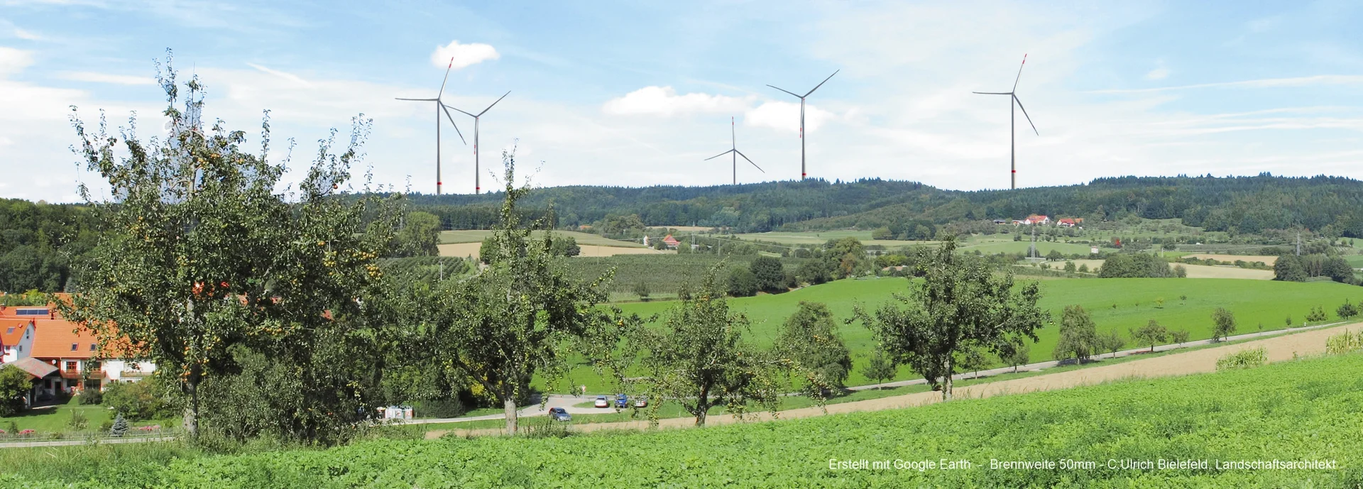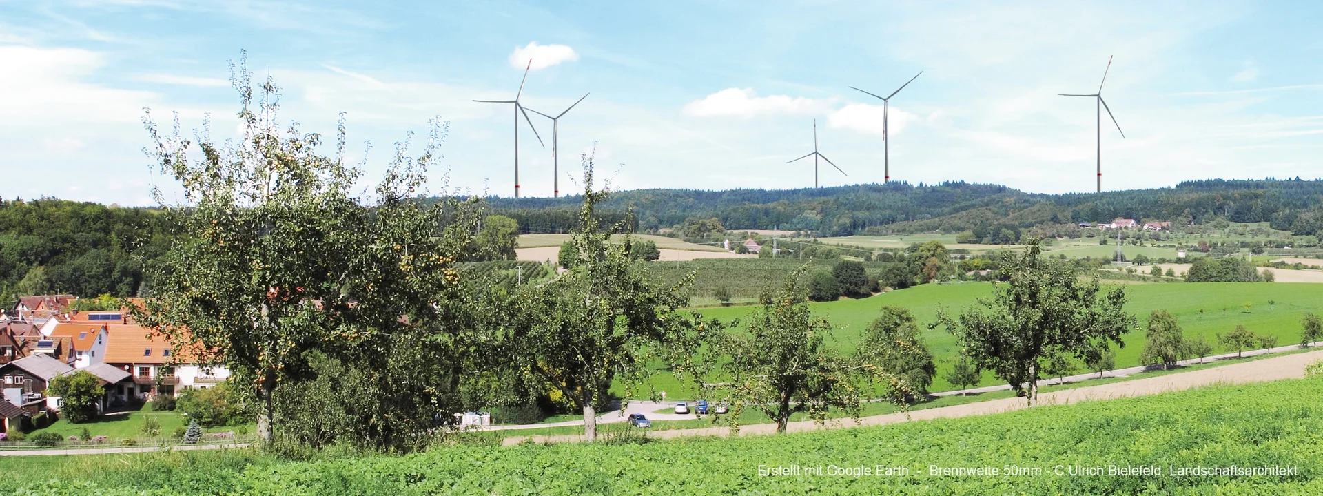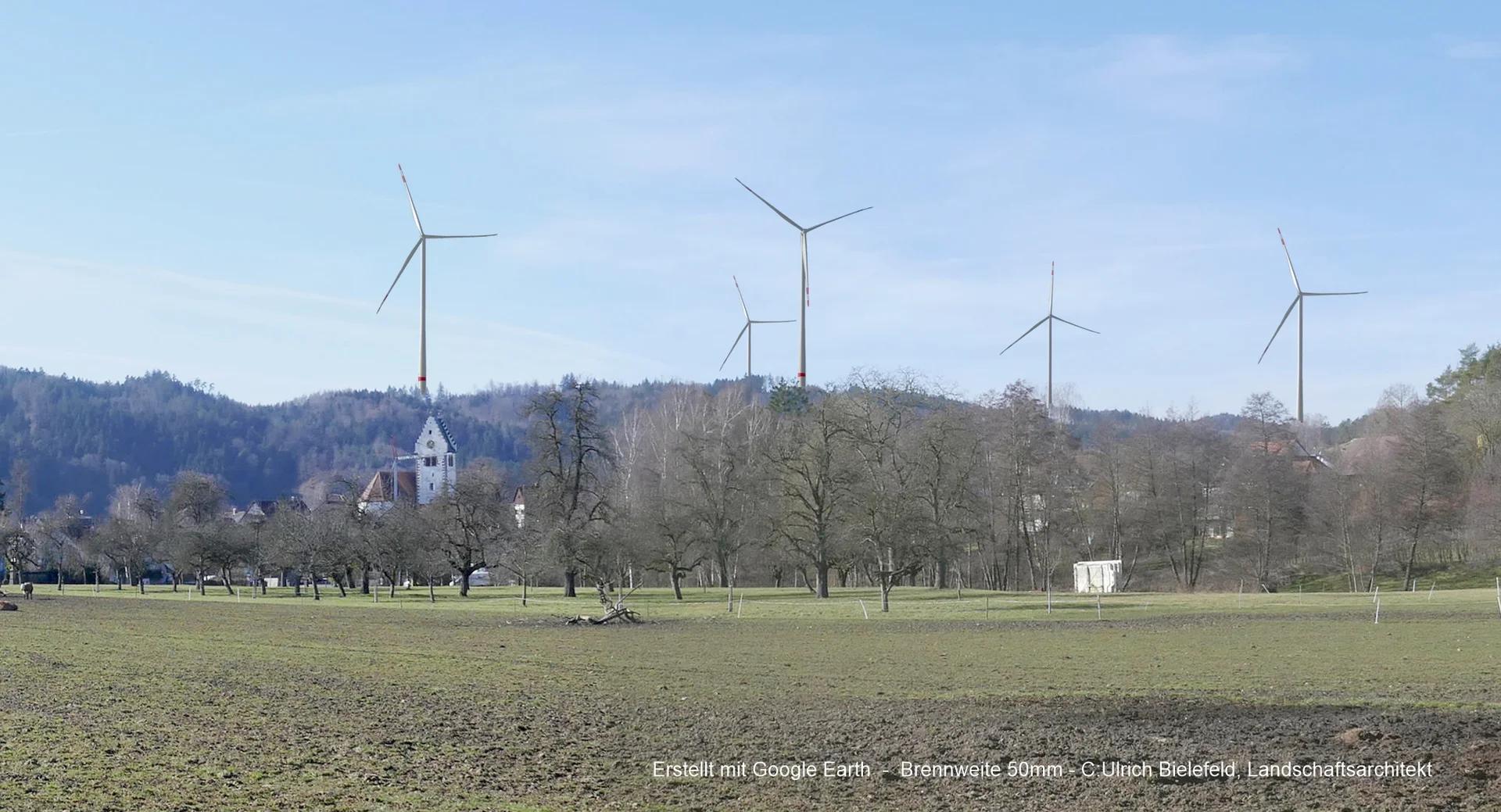 Die Bilder sind maßstabgetreu erstellt mit Google Earth von Ulrich Bielefeld (Dipl.-Ing. Landschaftsarchitekt). Das in Google Earth eingesetzte Windradmodell ist 300m hoch.