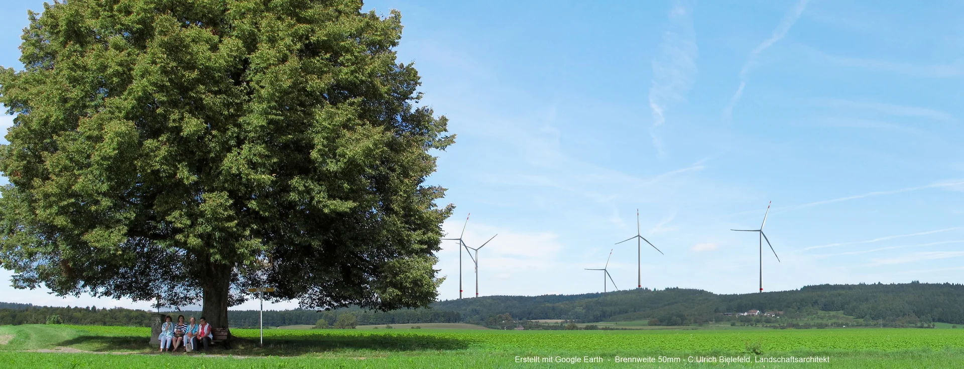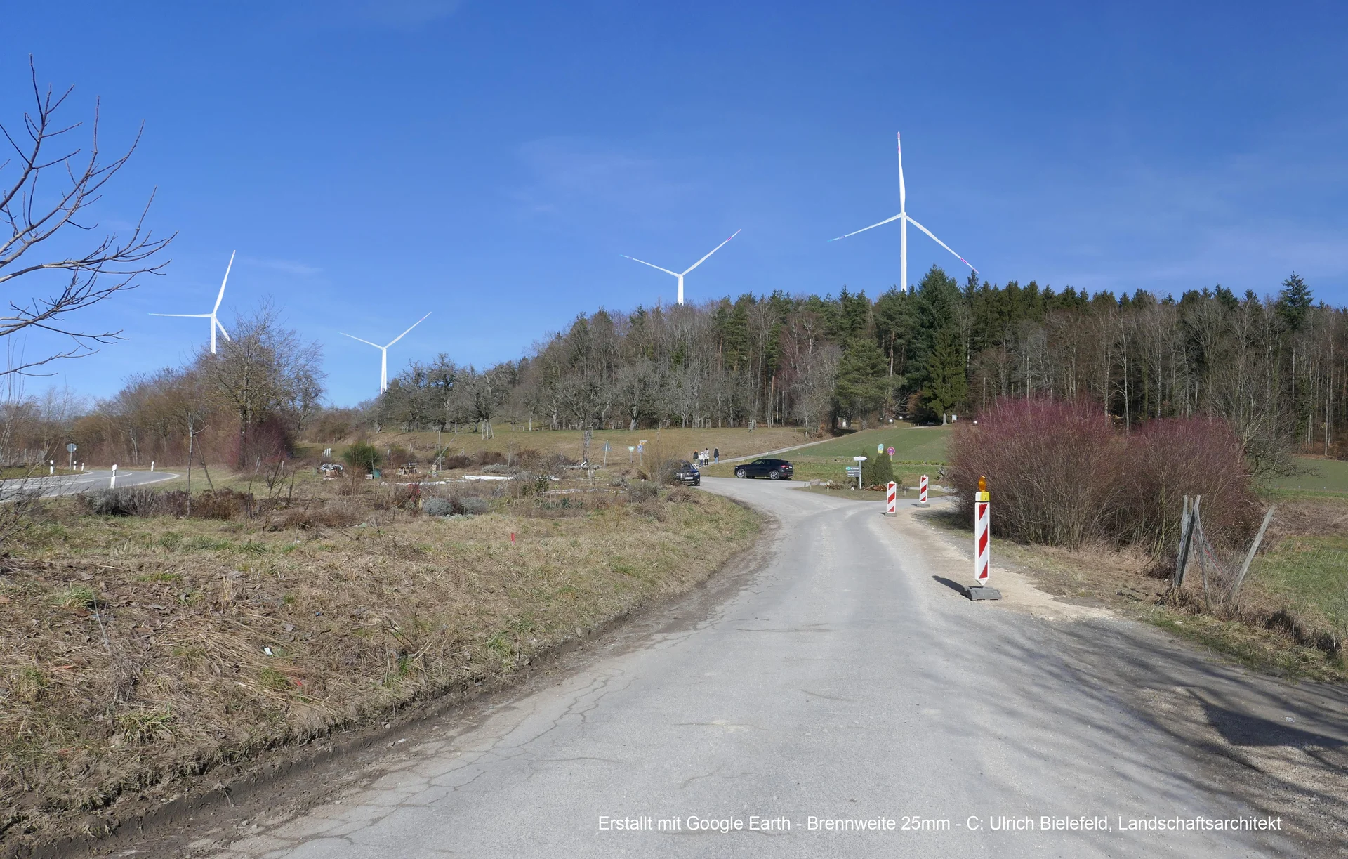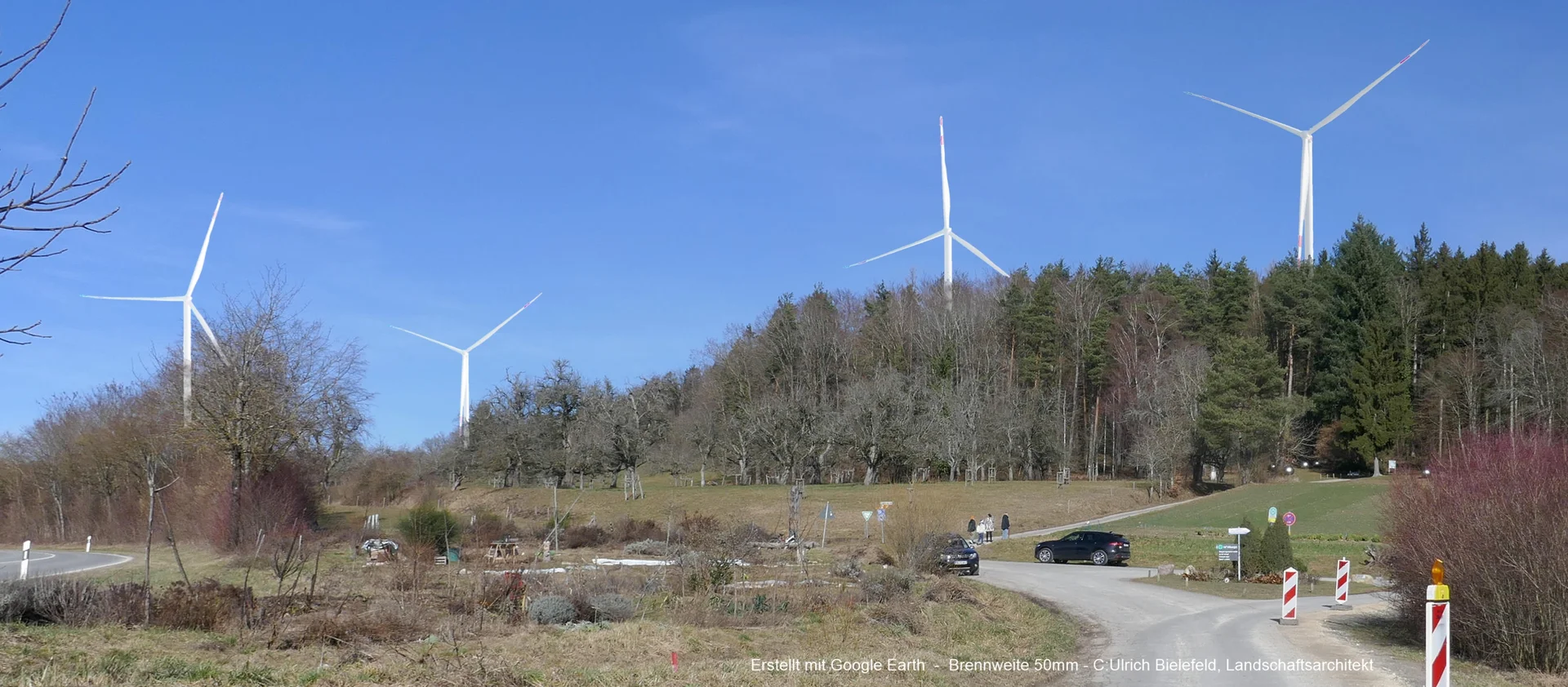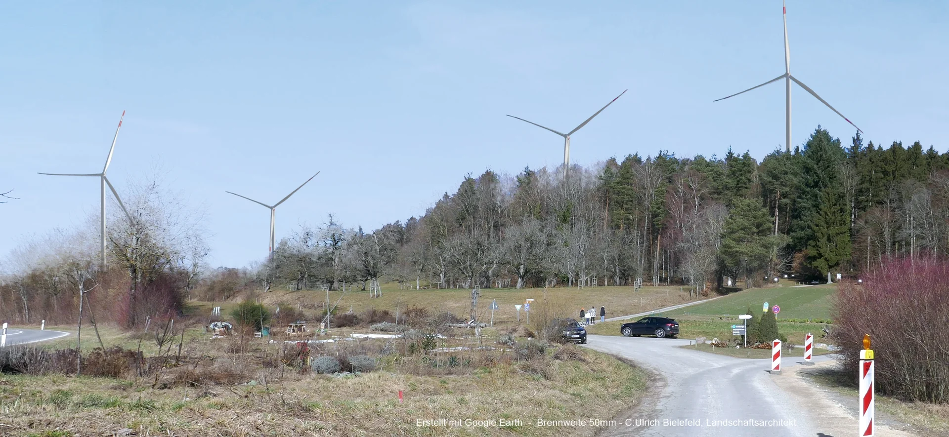 Die Bilder sind maßstabgetreu erstellt mit Google Earth von Ulrich Bielefeld (Dipl.-Ing. Landschaftsarchitekt). Das in Google Earth eingesetzte Windradmodell ist 300m hoch.