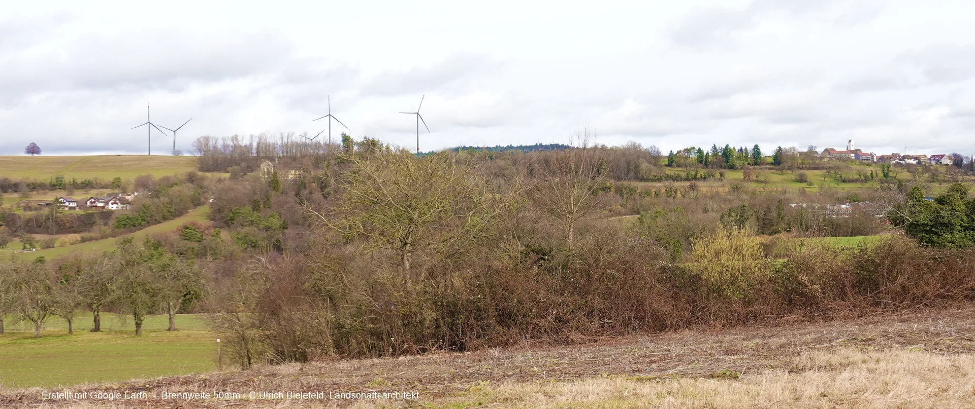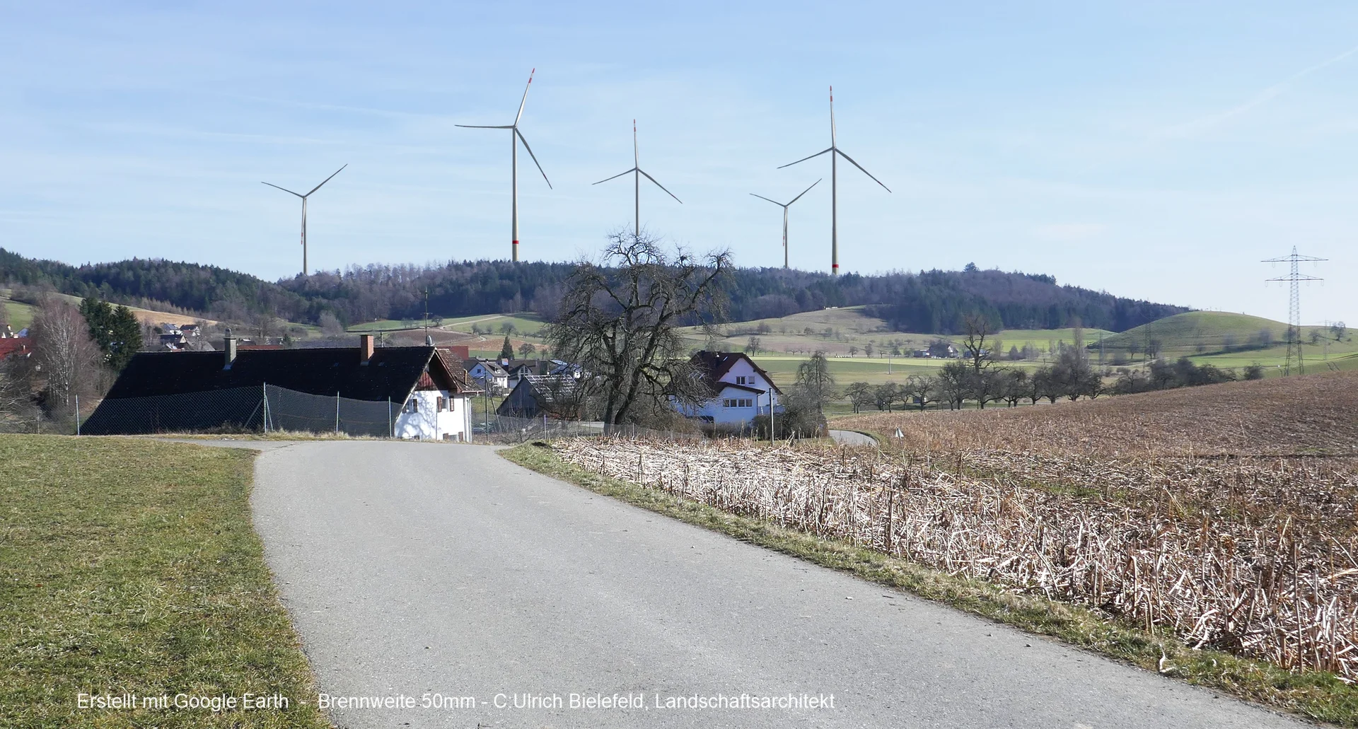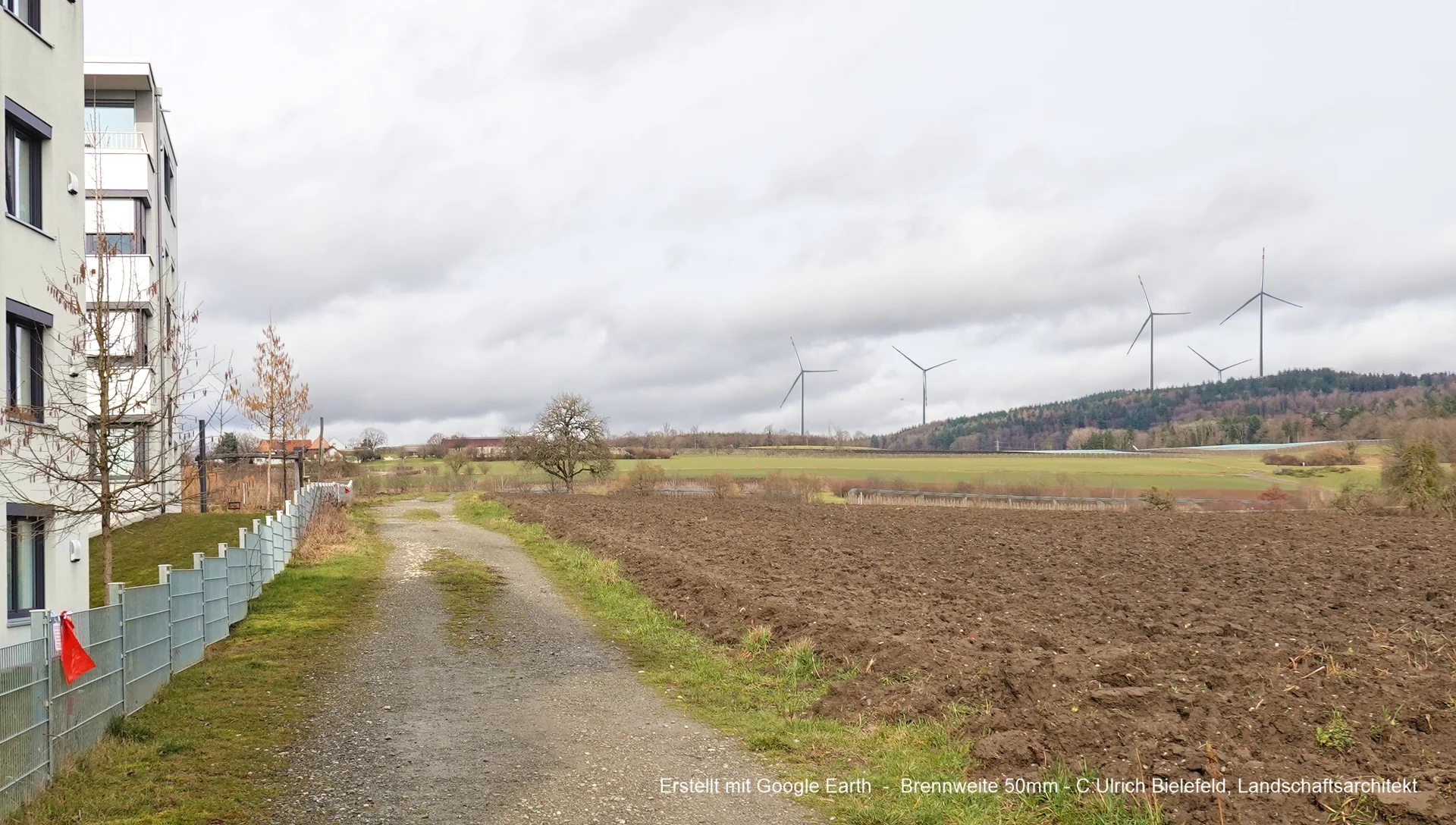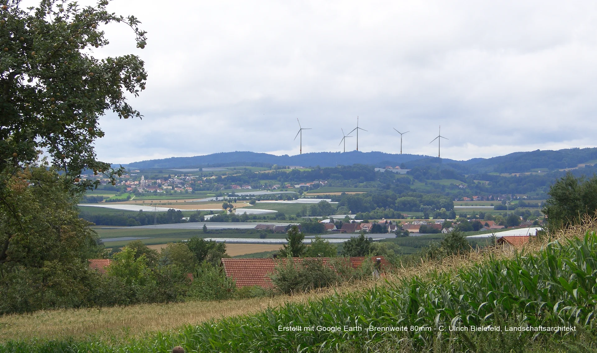 Die Bilder sind maßstabgetreu erstellt mit Google Earth von Ulrich Bielefeld (Dipl.-Ing. Landschaftsarchitekt). Das in Google Earth eingesetzte Windradmodell ist 300m hoch.