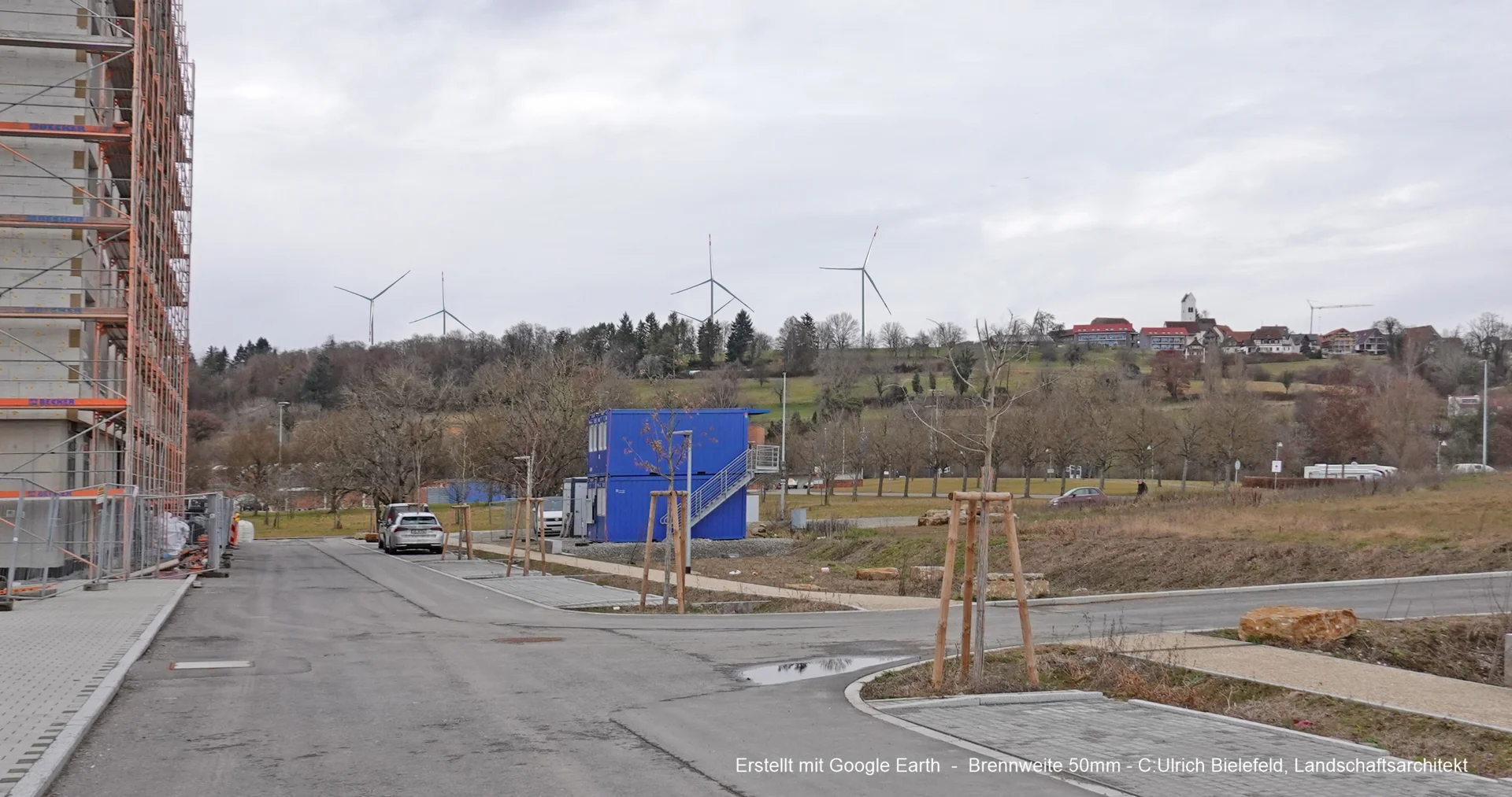 - Die maßgebliche Referenz für die Beurteilung der Größenwirkung sind unsere Visualisierungen mit Normalbrennweiten (ca. 50–60 mm). Tele‑Aufnahmen werden wo angebracht eingesetzt, um bestimmte Details oder Sichtachsen hervorzuheben, ersetzen aber nicht ohne weiteres die Beurteilung auf Basis der Normalbrennweite.