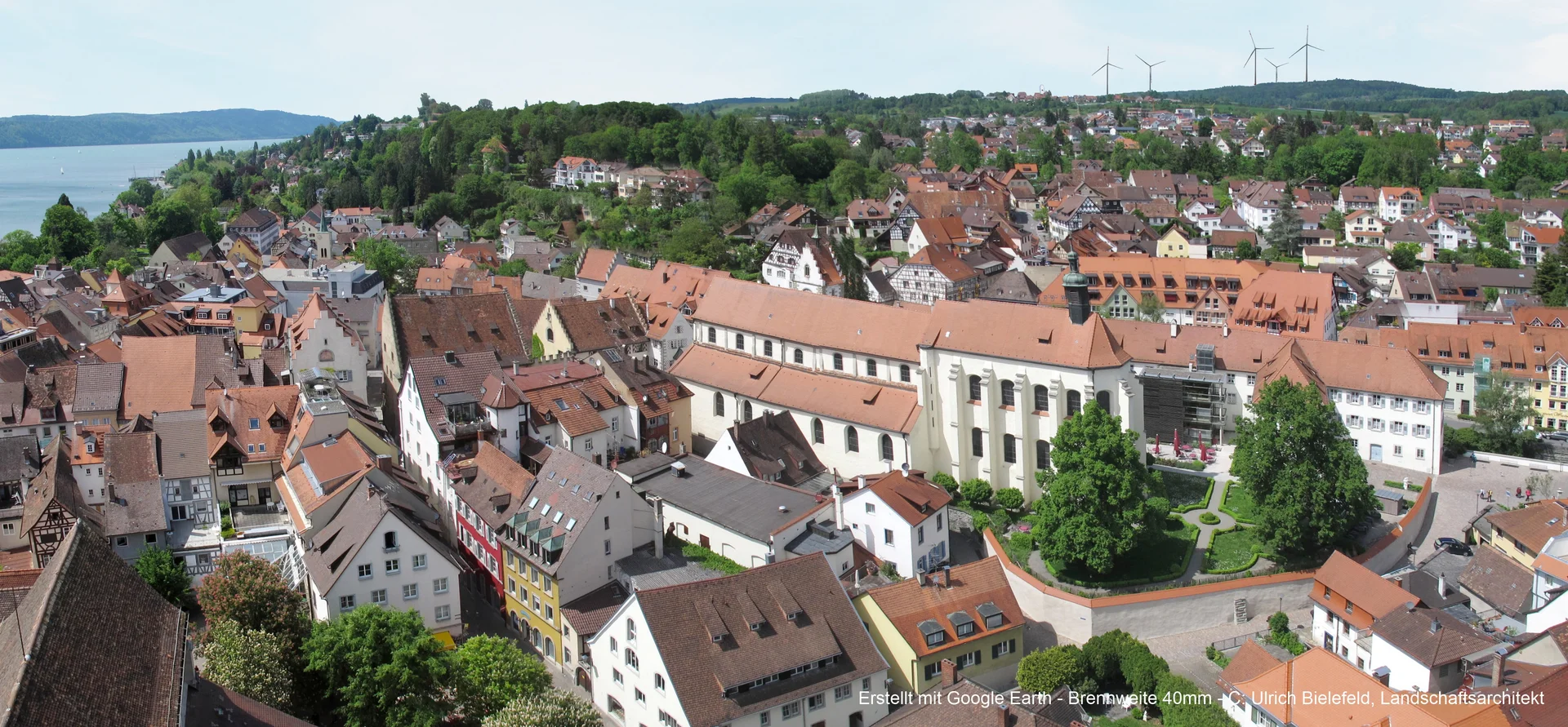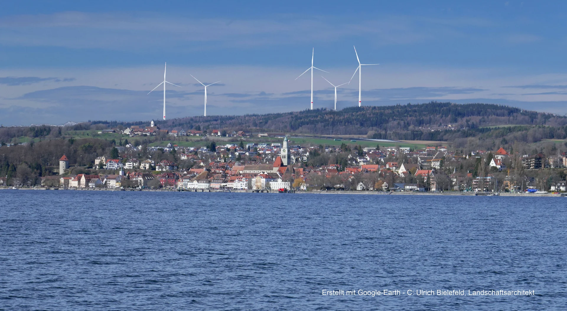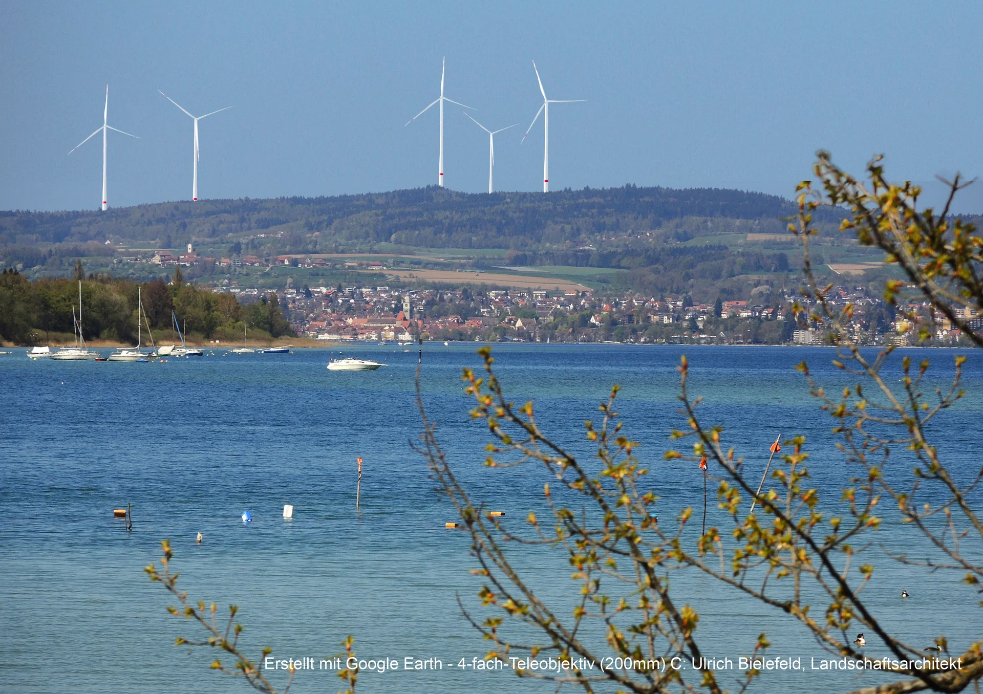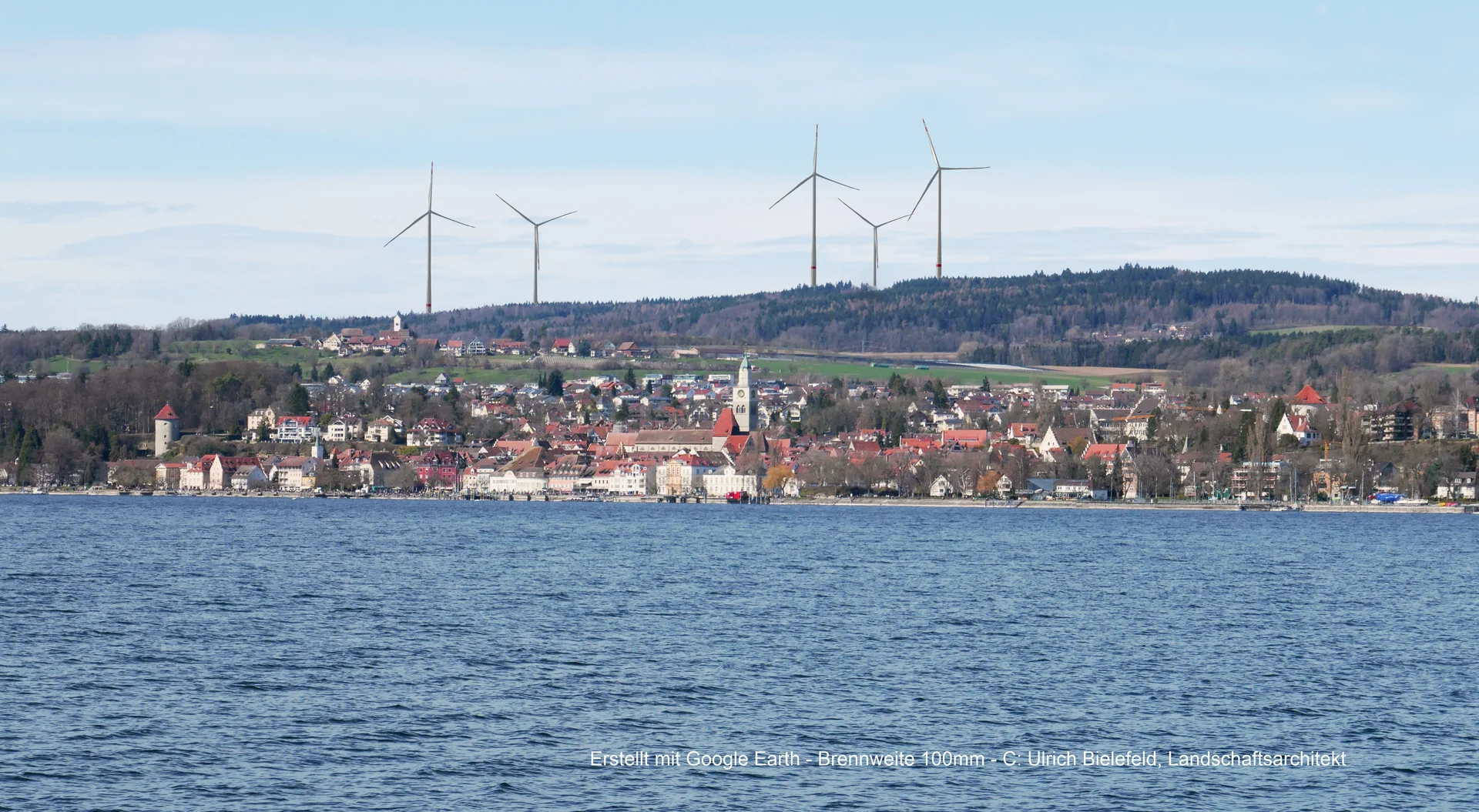 Das Bild gibt die Größenverhältnisse der fünf Windräder im Verhältnis zur Stadt Überlingen realistisch wieder. Die Anlagen sind maßstäblich eingesetzt; die verwendete 100‑mm‑Brennweite ist in diesem Fall als ergänzende Tele‑Detailansicht zu verstehen, weil die Kamera deutlich weiter von den Windrädern entfernt über dem See steht.
