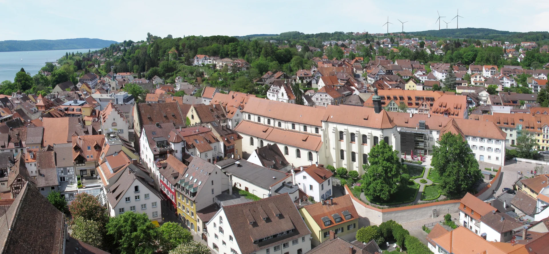 - Die Stadt Überlingen liegt im Uferbereich des Bodensees auf etwa 400 m über Meer, der Höhenrücken des Hochbühl erreicht rund 700–720 m. Die Höhendifferenz zwischen Stadtgebiet und Hochbühl beträgt damit ungefähr 300 m. Die in der Visualisierung dargestellten Windkraftanlagen haben eine geplante Gesamthöhe von rund 300 m (Nabenhöhe plus Rotorblattspitze oben). Windkraftanlagen dieser Größenordnung entsprechen den heute für vergleichbare Standorte typischen Anlagen der 5 – 7 MW‑Klasse. Die Anlagen wären also in ihrer Höhe in etwa so groß wie der gesamte Anstieg vom Seeufer hinauf zum Hochbühl.