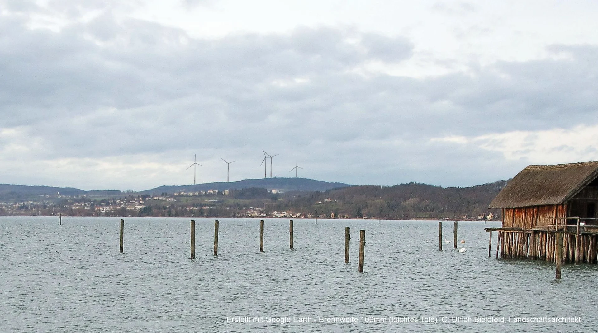 - Das heißt: Wer von Überlingen zum Hochbühl hinaufschaut, blickt über ungefähr 300 m Höhenunterschied. Ein Windrad mit etwa 300 m Gesamthöhe verdoppelt diesen Höhenraum in der Vertikalen. Die im Bild gezeigten Dimensionen stimmen deshalb in der Größenordnung mit den tatsächlichen Höhenverhältnissen überein. Die genannten Höhenwerte lassen sich in amtlichen Karten oder in Google Earth leicht nachprüfen; so können Sie selbst kontrollieren, ob die Größenrelationen plausibel sind.