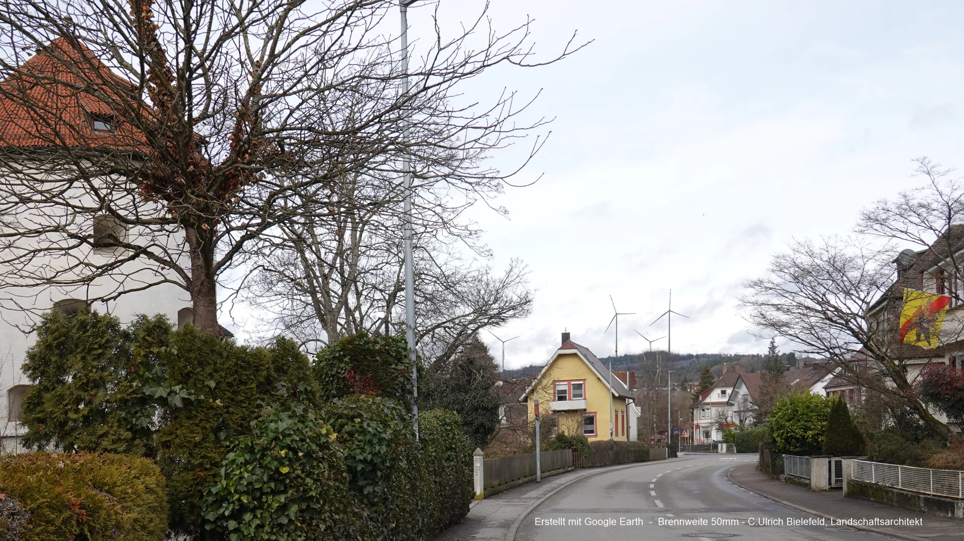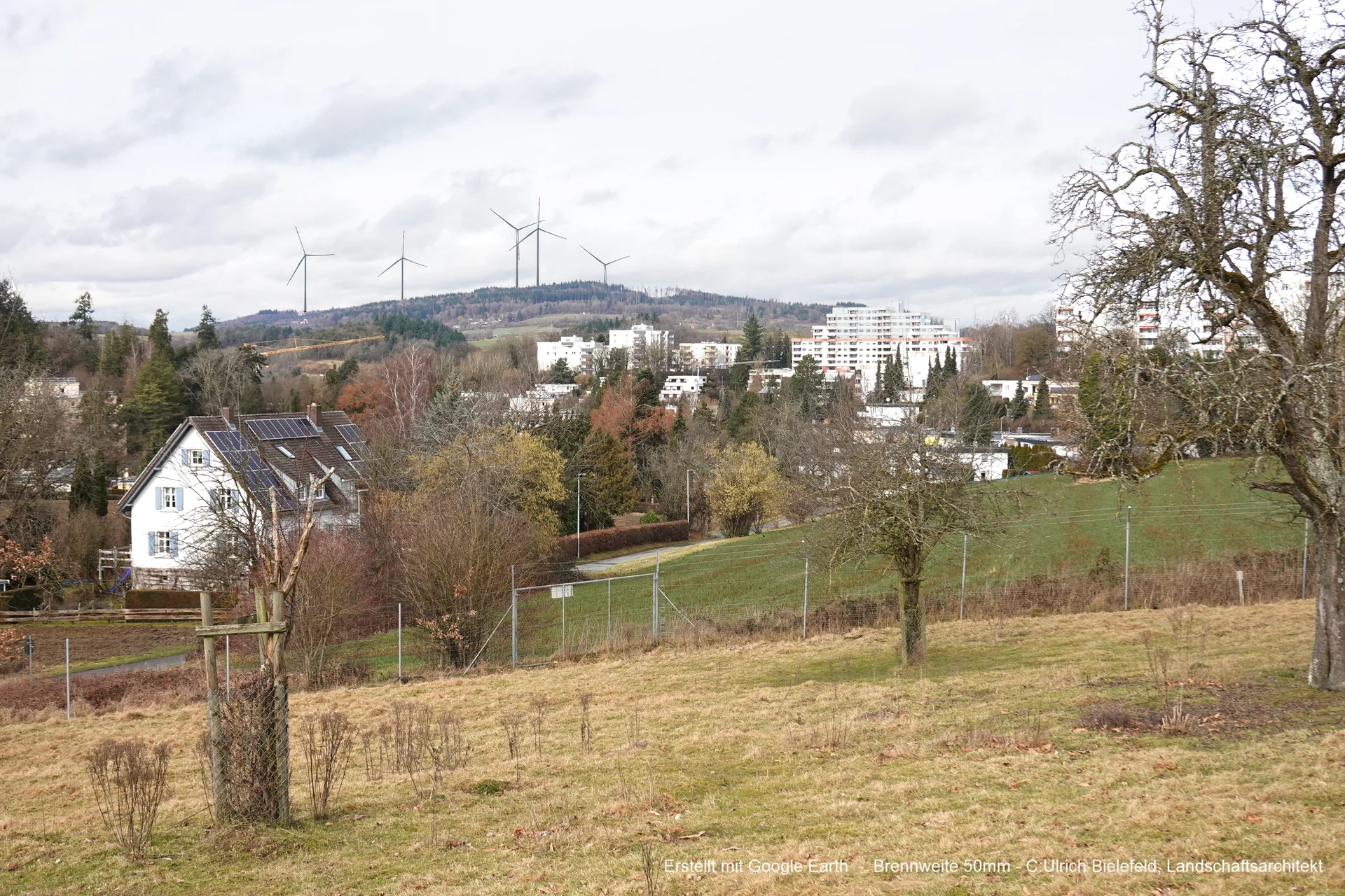 Für die Einschätzung der Dimensionen ist deshalb vor allem wichtig, dass die Gesamthöhe der Windräder von rund 300 m in etwa der Höhendifferenz zwischen Stadtgebiet und Hochbühl, auch rund 300 m, entspricht – ganz gleich, mit welcher Brennweite fotografiert wird.